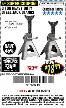 Harbor Freight | Page 2 - ClassicBroncos.com Forum Thank you for contacting Harbor Freight Tools. For models 61196 and 61197 a label located on the base of the jack stands identifies the item by its model number. For model 56371 a label located on the top of the jack stands identifies the item by its model number. All jack stands with these model numbers are part of the recall. Coupon: 15% Off Any Pittsburgh Product thru 1/2 - Harbor Freight Coupons Code 99848912 · Exp. 1/2/2022 · Save coupon. Save 15% off any Pittsburgh product at Harbor Freight Tools with coupon code 99848912, valid from Friday 12/31/2021 through Sunday 1/2/2022. Redeem this offer in-store or online. If you're an Inside Track Club Member you could save EVEN MORE. Members save 20% off instead of 15% off. Harbor Freight Tools Coupon Database - Coupon Search for: 1 HERCULES 20V TOOL KIT Lot No. HC91K1 Valid Thru: 12/31/50 - $10 Coupon Code: '24466148' view all (1) (current price No % off) add to list 20 VOLT LITHIUM CORDLESS 1/4" HEX COMPACT IMPACT DRIVER KIT Lot No. 64755/63528 Valid Thru: 5/22/22 - $54.99 Coupon Code: '73425388' view all (1) ( current price - 20% = 0) add to list PITTSBURGH AUTOMOTIVE 3 Ton Steel Jack Stands for $18.99 - Harbor ... Buy the PITTSBURGH AUTOMOTIVE 3 Ton Steel Jack Stands (Item 38846) for $18.99 with coupon code 66895671, valid through June 30, 2020. See the coupon for details.Compare our price of $18.99 to Torin Jack at $34.99 (model number: 1007102). Save 45% by shopping at Harbor Freight.These heavy-duty steel jack stands safely support loads up to…
