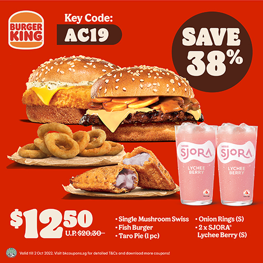 Burger King Weekly Ads, Deals & Flyers September 2022 Today's top Burger King weekly ads, flyers. Latest Burger King promotions, offers & deals September 2022. Search by Brand. Download App. Apple App Store ... 54 Burger King Weekly Ads, Coupons & Flyers. Deal Burger King Rolls Out a Tasty Line Up of New BK Royal Crispy Chicken Sandwiches. Burger King Coupon Deals: 1-for-1 deals & more | September 2022 | SGDtips - S$16.90 Party Meal for 3 (Save 50%) with Mushroom Swiss Tendergrill™ Chicken Burger, BBQ Chicken Burger, Whopper, BK Nuggets (6pcs), Onion Rings (M), 3 x Coke (S). Promo code: AA21Code is copied. - S$20.90 Bundle for 3 (Save 42%) with 2 x Whopper, Long Chicken™, 2 x Onion Rings (L), Hershey's Sundae Pie, Taro Pie (1pc), 2 x Coke (S).