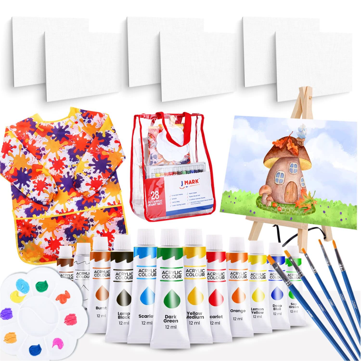 J MARK Paint Set for Kids - Acrylic Painting Kit with Storage Bag, Non Toxic Washable Paints, Scratch Free Wood Easel, Canvases, Brushes, Well ...