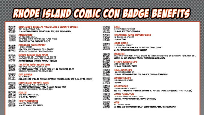 Rhode Island Comic Con Discount, Tickets, Deal Rhode Island Comic Con brings together fun, cosplay, gaming, celebrities, artists without all the hoops to jump through. Let the smallest state in the union show you the biggest fun at RI Comic Con! Frequently Asked Questions. There are no current questions and answers, be the first to ask a question.